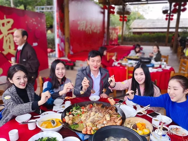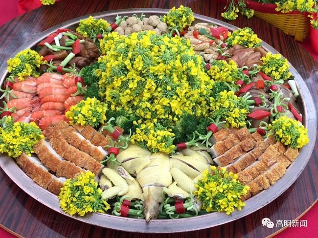 经过多年的打造,高明盈香油菜花节已经成为一个“赏花+美食”的节庆活动。来自禅城的江女士和家人游玩完,就来品尝油菜花宴。